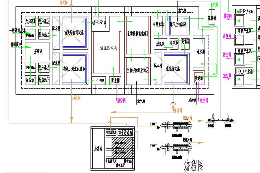 油墨廢水:油墨廢水主要來(lái)自顯影后水洗工序、去膜后水洗、除油后水洗,現(xiàn)在有機(jī)物含量高,廢水經(jīng)收集至調(diào)節(jié)池,調(diào)節(jié)池進(jìn)行分隔處理,調(diào)節(jié)池中加曝氣管和PH 控制儀,在該池通過(guò) PH 控制儀控制投加酸PH至 2-3左右讓溶解在廢水的高分子感光膜類由于分子結(jié)構(gòu)的變化重新析出,通過(guò)氣動(dòng)泵抽至板框壓濾機(jī)泥水分離,過(guò)濾后濾液進(jìn)入芬頓池,通過(guò)加入 H2O2 作為氧化劑,FeSO4 作為催化劑對(duì)廢水中可溶性有機(jī) 物進(jìn)一步氧化,Fenton試劑由于催化反應(yīng),產(chǎn)生大量 OH&(羥基自由基)其氧化較其它 絕大部分氧化劑氧化電位高,因此普遍應(yīng)用于各類有機(jī)廢水的處理,一方面鐵離子即是催化劑,另一方面經(jīng)過(guò)調(diào)節(jié) PH 值后他又是很好的混凝劑。氧化后的廢水通過(guò)投加燒堿調(diào)節(jié) PH 值至 9 左右,投加重捕劑、PAC、PAM 混凝沉淀后,此時(shí)有機(jī)廢水中的大部分 有機(jī)物已去除,經(jīng)分析 COD 的去除率可達(dá) 70~80%,但這部分廢水其 COD 含量相對(duì)其它 幾股廢水仍然較高,回調(diào) PH 后進(jìn)入生化系統(tǒng),因這部分水作為外排水,水質(zhì)指標(biāo)要達(dá)到《地表水環(huán)境質(zhì)量標(biāo)準(zhǔn)》(GB 3838-2002)中的Ⅳ類標(biāo)準(zhǔn)與《廣東省水污染物排放限 值》(DB44/26—2001)第二時(shí)段一級(jí)標(biāo)準(zhǔn)的較嚴(yán)值,后續(xù)我們采用臭氧氧化后進(jìn)生物 濾池深度處理,確保穩(wěn)定達(dá)標(biāo)排放。